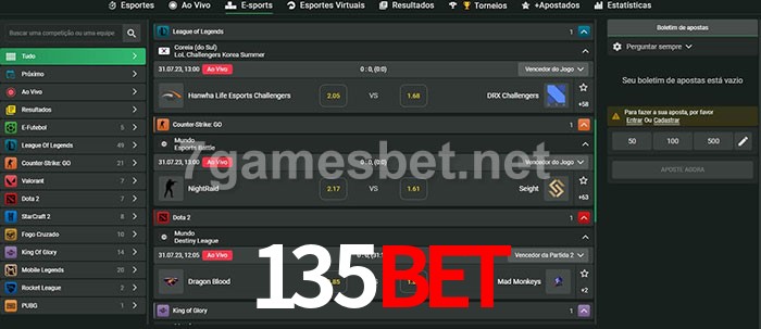 O 135Bet oferece uma grande seleção de opções de apostas em e-sports com probabilidades competitivas